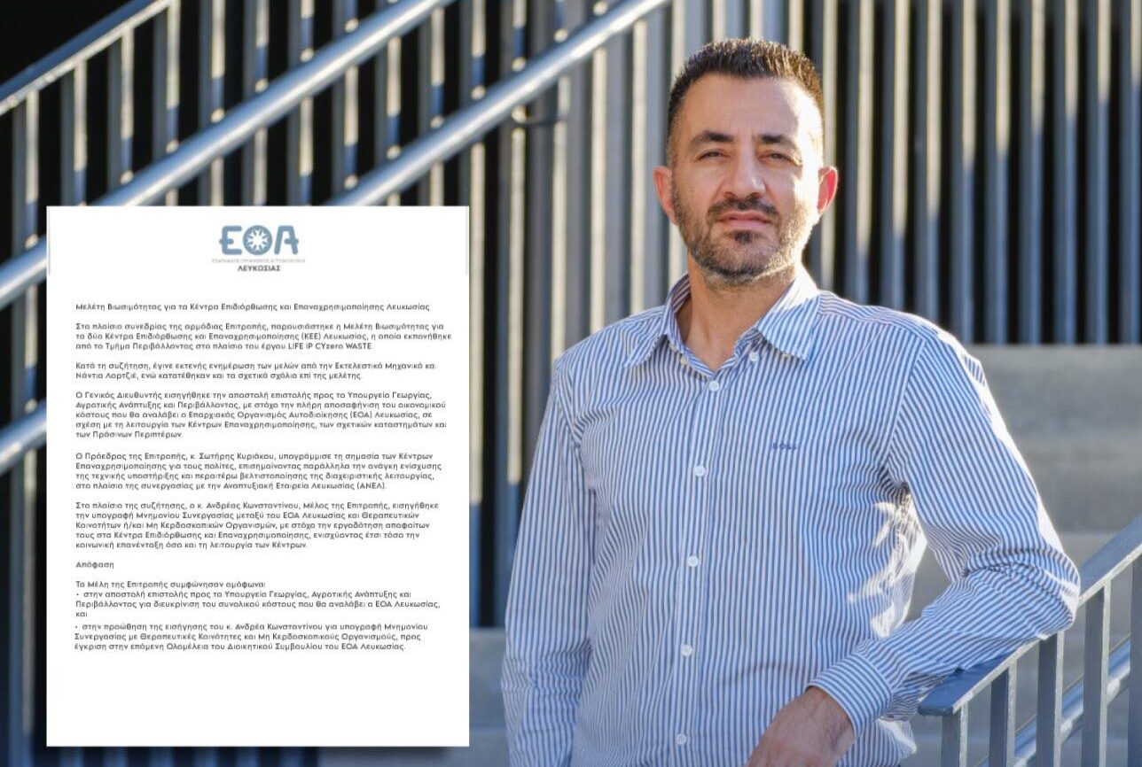 Εκφράζω την ικανοποίησή μου για την ομόφωνη έγκριση της πρότασής μου από τον ΕΟΑ Λευκωσίας, για εργοδότηση αποφοίτων της Θεραπευτικής Κοινότητας «Αγία Σκέπη» στο Κέντρο Επιδιόρθωσης και Επαναχρησιμοποίησης των πράσινων σημείων Λευκωσίας. Η κοινωνική πολιτική μπορεί και πρέπει να έχει ουσία.